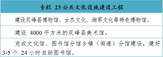 59.發(fā)展公共文化事業(yè)。完善縣、鄉(xiāng)、村三級(jí)公共文化服務(wù)體系,加大公共文化設(shè)施投入和政府購買公共文化服務(wù)力度,創(chuàng)新實(shí)施文化惠民工程,促進(jìn)基本公共文化服務(wù)均等化,基本實(shí)現(xiàn)公共文化設(shè)施網(wǎng)絡(luò)全面覆蓋、互聯(lián)互通。堅(jiān)持以人民為中心的創(chuàng)作導(dǎo)向,提升文藝原創(chuàng)能力,推出一批具有雙峰特色的文藝精品,培養(yǎng)一批名家名人,培育一批知名文化企業(yè)。開展建黨100周年主題系列文化活動(dòng)。加強(qiáng)圖書館、文化館、博物館、美術(shù)館建設(shè),充分利用現(xiàn)有文化陣地,最大限度向社會(huì)提供公共服務(wù)。推進(jìn)圖書館、文化館總分館制建設(shè),到2025年,實(shí)現(xiàn)鄉(xiāng)鎮(zhèn)、文化館分館全覆蓋。整合蔡和森蔡暢紀(jì)念館和故居資源,做好衡寶戰(zhàn)役烈士紀(jì)念碑(墓)等革命歷史文物保護(hù)利用工作,做好光甲堂保護(hù)和開發(fā),加強(qiáng)縣內(nèi)古建筑的修繕、保護(hù)和開發(fā),建好女杰文化?,打造有影響力的紅色文化教育和紅色旅游基地。積極申報(bào)蔡和森蔡暢故居及蔡和森紀(jì)念館為全國婦女愛國主義教育基地。加快媒體融合發(fā)展,建設(shè)好縣級(jí)融媒體中心。培育文化服務(wù)主體,廣泛開展群眾性文化活動(dòng)。保護(hù)和傳承“溪硯”“永豐辣醬”“民間剪紙”“木偶戲”等非物質(zhì)文化遺產(chǎn),強(qiáng)化重要文化和自然遺產(chǎn)、非物質(zhì)文化遺產(chǎn)系統(tǒng)性保護(hù)。
