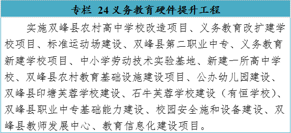 63.辦好人民滿意教育。全面貫徹黨的教育方針,落實(shí)立德樹人根本任務(wù),培養(yǎng)德智體美勞全面發(fā)展的社會(huì)主義建設(shè)者和接班人。加強(qiáng)教師隊(duì)伍建設(shè),實(shí)施鄉(xiāng)村教師支持計(jì)劃(2021—2025年),完善編制管理機(jī)制,強(qiáng)化師德師風(fēng)建設(shè),提升教師教書育人能力素質(zhì),保障教師待遇,加強(qiáng)公費(fèi)師范生培養(yǎng),完善教師隊(duì)伍人才招引機(jī)制。堅(jiān)持教育公益性原則,深化教育改革,全面優(yōu)化教育結(jié)構(gòu),加快構(gòu)建科學(xué)的教育評(píng)價(jià)體系,促進(jìn)教育公平,推動(dòng)義務(wù)教育優(yōu)質(zhì)均衡發(fā)展。完善普惠性學(xué)前教育和特殊教育、專門教育保障機(jī)制,鼓勵(lì)高中階段學(xué)校多樣化發(fā)展,“十四五”期間中心城區(qū)新建3所九年一貫制學(xué)校,防止大班額現(xiàn)象反彈,九年義務(wù)教育鞏固率保持99.5%以上,高中階段教育毛入學(xué)率達(dá)到90%左右。大力發(fā)展職業(yè)教育,加大學(xué)位建設(shè)力度,推動(dòng)縣職業(yè)中專辦學(xué)層次升級(jí)為高職專科,建設(shè)一批產(chǎn)教融合實(shí)驗(yàn)實(shí)訓(xùn)基地,增強(qiáng)職業(yè)教育與本地產(chǎn)業(yè)發(fā)展結(jié)合度,提升職業(yè)教育服務(wù)雙峰轉(zhuǎn)型發(fā)展的能力。提升學(xué)前教育發(fā)展水平,加大公辦幼兒?建設(shè)力度,到2025年新建、改擴(kuò)建公辦幼兒?15所以上,新增公辦幼兒?學(xué)位5000個(gè)以上,全縣學(xué)前三年毛入園率達(dá)到86%以上。深化學(xué)校思想政治理論課改革創(chuàng)新,廣泛開展勞動(dòng)教育,加強(qiáng)和改進(jìn)學(xué)校體育美育,發(fā)展素質(zhì)教育。支持和規(guī)范民辦教育發(fā)展,規(guī)范校外培訓(xùn)機(jī)構(gòu)。完善全民終身學(xué)習(xí)推進(jìn)機(jī)制,建設(shè)學(xué)習(xí)型社會(huì)。