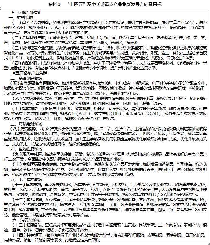 建設(shè)具有競爭力的先進(jìn)制造業(yè)集群。發(fā)揮支柱產(chǎn)業(yè)基礎(chǔ)優(yōu)勢,加快調(diào)整優(yōu)化產(chǎn)品結(jié)構(gòu),提升自主創(chuàng)新能力,拓展產(chǎn)業(yè)鏈條,建設(shè)鏈群完善、生態(tài)完備、特色明顯,發(fā)展質(zhì)量效益高的先進(jìn)制造業(yè)基地。構(gòu)建千億級材料產(chǎn)業(yè)集群。重點(diǎn)發(fā)展特種金屬材料、高分子合成材料、新型建筑材料,建設(shè)成渝地區(qū)雙城經(jīng)濟(jì)圈“材料第一大區(qū)”和具有全國影響力的合成材料基地。構(gòu)建清潔能源、裝備制造、生物醫(yī)藥、電子信息、消費(fèi)品五百億級產(chǎn)業(yè)集群。發(fā)揮涪陵國家級頁巖氣示范區(qū)引領(lǐng)作用,加強(qiáng)頁巖氣綜合開發(fā)利用,推進(jìn)風(fēng)能、太陽能和新型電池、生物質(zhì)能等開發(fā),建設(shè)國內(nèi)重要的新能源產(chǎn)業(yè)化基地,打造中國“氣大慶”。推動汽車整車、船舶等裝備制造高端化、智能化轉(zhuǎn)型,加快中高端乘用車、特種車及零部件、特種船舶研發(fā),拓展軌道交通、電力自動化與智能電網(wǎng)設(shè)備等領(lǐng)域,建設(shè)重慶重要智能裝備生產(chǎn)基地。加快中醫(yī)藥全鏈條新藥研發(fā)生產(chǎn)體系建設(shè),大力發(fā)展醫(yī)養(yǎng)結(jié)合產(chǎn)業(yè)和醫(yī)療器械、醫(yī)療包材產(chǎn)業(yè),建設(shè)現(xiàn)代中醫(yī)藥產(chǎn)業(yè)發(fā)展高地。加速集聚集成電路、智能芯片、新型顯示、高端服務(wù)器等核心基礎(chǔ)產(chǎn)業(yè),打造具有較強(qiáng)區(qū)域協(xié)同能力的信息技術(shù)產(chǎn)業(yè)體系。深入實(shí)施增品種、提品質(zhì)、創(chuàng)品牌“三品”行動,加快工業(yè)設(shè)計和文化創(chuàng)意在消費(fèi)品領(lǐng)域植入滲透,大力培育健康食品、糧油加工、產(chǎn)業(yè)用紡織品、智能家居等新興鏈條,建設(shè)重要消費(fèi)品工業(yè)基地。