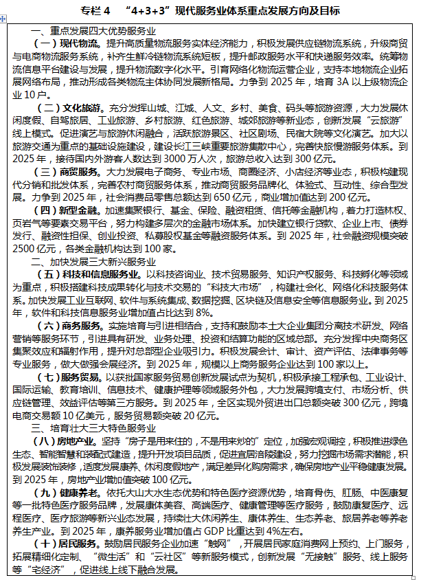 提升現(xiàn)代服務(wù)業(yè)能級水平。以擴(kuò)大開放合作、公平市場準(zhǔn)入、創(chuàng)新制度供給為重點(diǎn),推動生產(chǎn)性服務(wù)業(yè)向?qū)I(yè)化和價值鏈高端延伸,生活性服務(wù)業(yè)向高品質(zhì)和多樣化升級,著力構(gòu)建“4+3+3”現(xiàn)代服務(wù)業(yè)發(fā)展體系。擴(kuò)大物流發(fā)展規(guī)模和能級,大力發(fā)展供應(yīng)鏈物流、商貿(mào)物流、冷鏈物流、快遞物流等新業(yè)態(tài),建設(shè)區(qū)域性物流中心和節(jié)點(diǎn)城市。深度融入全市大都市、大三峽、大武陵旅游體系和巴蜀文化旅游走廊,促進(jìn)文旅有機(jī)融合、協(xié)同發(fā)展,建設(shè)人文風(fēng)景旅游目的地。增強(qiáng)金融服務(wù)實(shí)體經(jīng)濟(jì)能力,推動金融產(chǎn)品、金融業(yè)態(tài)、服務(wù)體系創(chuàng)新,建立健全多層次多功能金融市場體系。順應(yīng)網(wǎng)絡(luò)經(jīng)濟(jì)趨勢,加速傳統(tǒng)商貿(mào)向現(xiàn)代流通轉(zhuǎn)型,構(gòu)建區(qū)域性商貿(mào)中心。積極擴(kuò)大多元化服務(wù)貿(mào)易出口,提升貿(mào)易自由便利度,建設(shè)全國服務(wù)貿(mào)易創(chuàng)新發(fā)展試點(diǎn)城市。促進(jìn)商務(wù)服務(wù)、科技和信息服務(wù)、房地產(chǎn)、健康養(yǎng)老、居民服務(wù)等服務(wù)業(yè)高質(zhì)量發(fā)展。