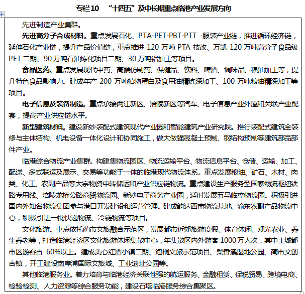 ——臨港經(jīng)濟(jì)區(qū)。輻射帶動龍橋街道、新妙鎮(zhèn)、藺市鎮(zhèn)、石沱鎮(zhèn),全域面積495平方公里,其中臨江臨港重點(diǎn)發(fā)展區(qū)域面積182平方公里。發(fā)揮產(chǎn)業(yè)集聚、開放創(chuàng)新、轉(zhuǎn)型升級的平臺引領(lǐng)作用和優(yōu)化城市布局、塑造城市特色、提高城市能級的戰(zhàn)略支點(diǎn)作用,重點(diǎn)突出互聯(lián)互通、產(chǎn)城融合、城鄉(xiāng)融合、文旅融合、綠色發(fā)展,提升航運(yùn)物流樞紐功能,大力發(fā)展現(xiàn)代物流、電子商務(wù)、先進(jìn)制造、文化旅游等產(chǎn)業(yè)。加快完善城市功能,深化以城帶鄉(xiāng),保護(hù)和改善生態(tài)環(huán)境,構(gòu)筑“一核一廊三組團(tuán)”新格局,延續(xù)涪陵“青山環(huán)抱、綠水繞城、大氣磅礴”的自然本底和原創(chuàng)氣質(zhì),著力構(gòu)建“低碳生態(tài)綠色開發(fā)示范區(qū)、港產(chǎn)城景融合發(fā)展新典范”,建設(shè)成為長江中上游重要國際港口樞紐、生產(chǎn)服務(wù)型國家物流樞紐、西部陸海新通道重慶輔樞紐、成渝地區(qū)雙城經(jīng)濟(jì)圈重要臨港產(chǎn)業(yè)集聚區(qū)和山清水秀的濱江魅力生態(tài)城區(qū),加快打造立足重慶、輻射西南、服務(wù)全國的國家級內(nèi)河臨港經(jīng)濟(jì)區(qū)。