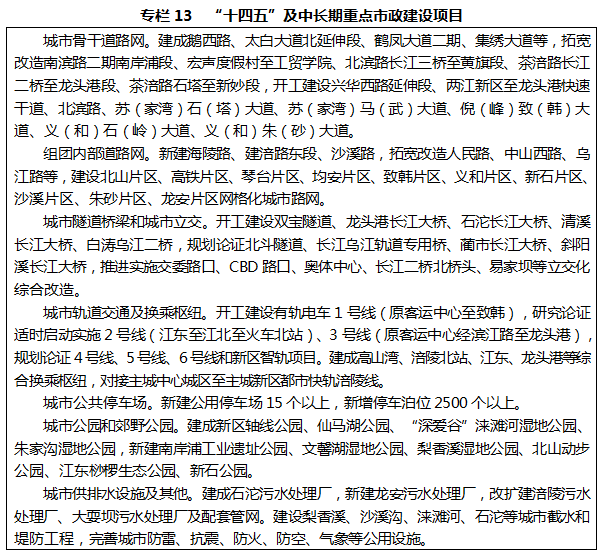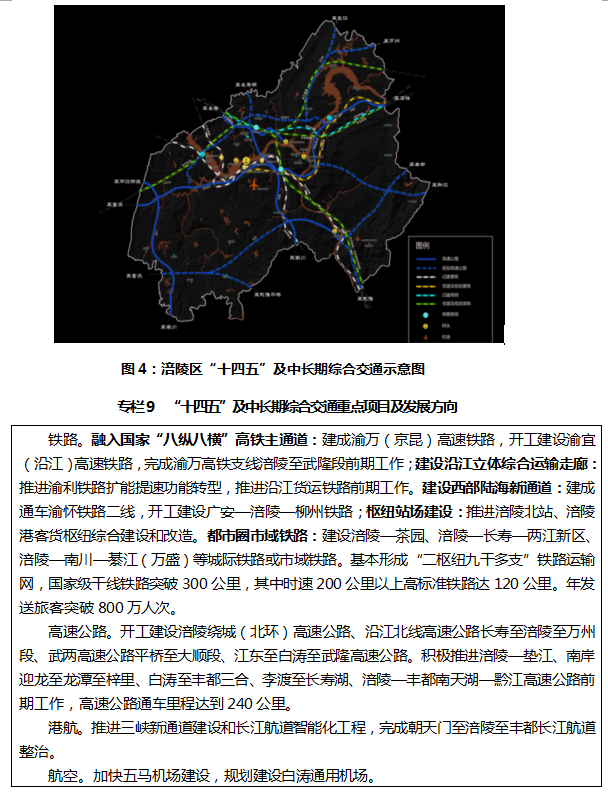 加快構(gòu)建出海出境對外大通道。加強(qiáng)鐵路主通道建設(shè),逐步構(gòu)建“兩樞紐九干線”骨干鐵路網(wǎng)。全面融入國家“八縱八橫”高鐵主通道,建設(shè)成渝地區(qū)雙城經(jīng)濟(jì)圈東出北上重要節(jié)點(diǎn),實(shí)現(xiàn)與京津冀、長三角、粵港澳大灣區(qū)、長江中游等主要城市群快速通達(dá)。建設(shè)長江經(jīng)濟(jì)帶重要鐵路貨運(yùn)樞紐,推動普通鐵路成環(huán)成網(wǎng)擴(kuò)能提速,加快貨運(yùn)鐵路進(jìn)園區(qū)、進(jìn)港區(qū)、進(jìn)廠區(qū),提升涪陵北站、龍頭港客貨樞紐集疏能力,構(gòu)建沿江立體綜合交通運(yùn)輸走廊、西部陸海新通道等四向?qū)ν庳涍\(yùn)鐵路通道。加快推進(jìn)實(shí)施一批高速公路,提升與成渝地區(qū)雙城經(jīng)濟(jì)圈和“一區(qū)兩群”互聯(lián)互通水平,努力建設(shè)“井”字型“二環(huán)十四射”網(wǎng)格式高速公路網(wǎng)。加快構(gòu)建與主城中心城區(qū)“半小時通勤圈”,利用渝利鐵路擴(kuò)能開通公交化客運(yùn)班列,建設(shè)市域鐵路和至主城中心城區(qū)快速干道,實(shí)現(xiàn)與主城中心城區(qū)高頻次、低成本快速通達(dá)。提升黃金水道綜合運(yùn)能,實(shí)施長江三峽水運(yùn)新通道,推進(jìn)烏江航道梯級渠化,提升涪陵港綜合集聚輻射能力。著力補(bǔ)齊航空發(fā)展短板,加快五馬機(jī)場建設(shè)。