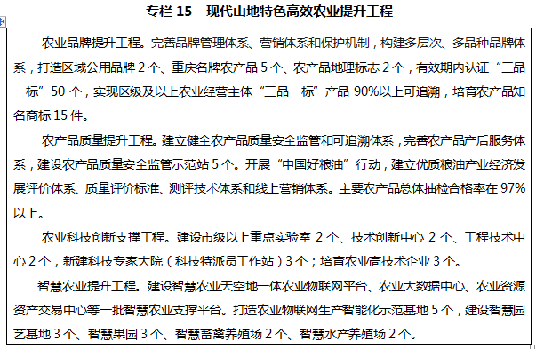 突出高產(chǎn)、優(yōu)質(zhì)、高效、生態(tài)、安全,推進(jìn)農(nóng)業(yè)由生產(chǎn)向生活服務(wù)和環(huán)境生態(tài)多功能轉(zhuǎn)變,積極發(fā)展都市型、生態(tài)型、外向型、品牌型山地特色高效農(nóng)業(yè),打造國家農(nóng)業(yè)現(xiàn)代化示范區(qū)。