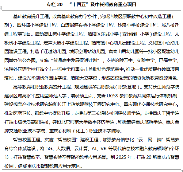 建設(shè)川渝產(chǎn)教融合示范區(qū)。突出“補(bǔ)短板強(qiáng)弱項(xiàng)”,全面實(shí)施高等教育和職業(yè)教育提升工程,發(fā)揮城?;幽J絻?yōu)勢,提升涪陵對優(yōu)質(zhì)教育資源的集聚承載能力,多元共建高等教育產(chǎn)教融合示范區(qū)。促進(jìn)高等教育內(nèi)涵式發(fā)展,推動長江師范學(xué)院建設(shè)應(yīng)用型高水平師范大學(xué),加快引進(jìn)一批理工類、醫(yī)學(xué)類、經(jīng)濟(jì)類知名院校設(shè)立分院分校,統(tǒng)籌推進(jìn)高水平大學(xué)、特色高校和新興學(xué)院建設(shè),打造環(huán)長江師范學(xué)院創(chuàng)新創(chuàng)業(yè)生態(tài)圈。深化職普融通、產(chǎn)教融合、校企合作,加快培育與重點(diǎn)產(chǎn)業(yè)相匹配的特色專業(yè)、特色學(xué)科、特色院校,加強(qiáng)川渝兩地職業(yè)教育互動,共商共建一批職教集團(tuán)、職教園區(qū)和共享性實(shí)訓(xùn)基地,規(guī)劃建設(shè)琴臺職教城。完善中職、高職、本科一體化人才培養(yǎng)模式,推動構(gòu)建人才培養(yǎng)立交橋,努力建設(shè)應(yīng)用型大學(xué)與專業(yè)性高校相結(jié)合,高等職業(yè)院校與中等職業(yè)學(xué)校相聯(lián)通,輻射川渝的職業(yè)教育中心。