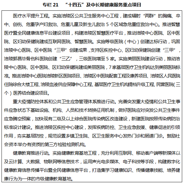 提升醫(yī)療衛(wèi)生服務(wù)水平。加強(qiáng)醫(yī)療衛(wèi)生服務(wù)體系建設(shè),優(yōu)化城鄉(xiāng)醫(yī)療衛(wèi)生資源配置,增強(qiáng)醫(yī)療衛(wèi)生服務(wù)集聚和輻射能力,促進(jìn)城鄉(xiāng)公共衛(wèi)生服務(wù)優(yōu)質(zhì)化均等化。大力開展健康涪陵人行動,聚力推進(jìn)“三甲”醫(yī)院創(chuàng)建,打造優(yōu)質(zhì)健康醫(yī)療示范區(qū)。加快現(xiàn)代化疾病預(yù)防控制體系建設(shè),改善疾病預(yù)防控制機(jī)構(gòu)基礎(chǔ)設(shè)施條件。全面強(qiáng)化新發(fā)突發(fā)急性傳染病能力,加強(qiáng)公共衛(wèi)生事業(yè)應(yīng)急保障能力,加強(qiáng)應(yīng)急醫(yī)療物資儲備。加強(qiáng)傳染病、慢性病、地方病等疾病預(yù)防控制。加快構(gòu)建智慧醫(yī)療體系,推進(jìn)健康大數(shù)據(jù)應(yīng)用新業(yè)態(tài)持續(xù)發(fā)展,創(chuàng)建一批市級“智慧醫(yī)院”示范。加強(qiáng)中醫(yī)藥和殘疾人康復(fù)事業(yè)扶持力度,提升老年人、婦女、兒童、殘疾人等特殊人群健康服務(wù)水平。抓好優(yōu)勢學(xué)科、特色專科建設(shè),大幅提升臨床服務(wù)、健康管理能力。完善職業(yè)健康監(jiān)管體系建設(shè),優(yōu)化職業(yè)病診斷程序和服務(wù),提升職業(yè)病綜合救治能力。實(shí)施“人才強(qiáng)衛(wèi)”工程,強(qiáng)化全科醫(yī)師等衛(wèi)生人才隊伍和醫(yī)德醫(yī)風(fēng)建設(shè),完善糾紛調(diào)解機(jī)制,構(gòu)建和諧醫(yī)患關(guān)系。