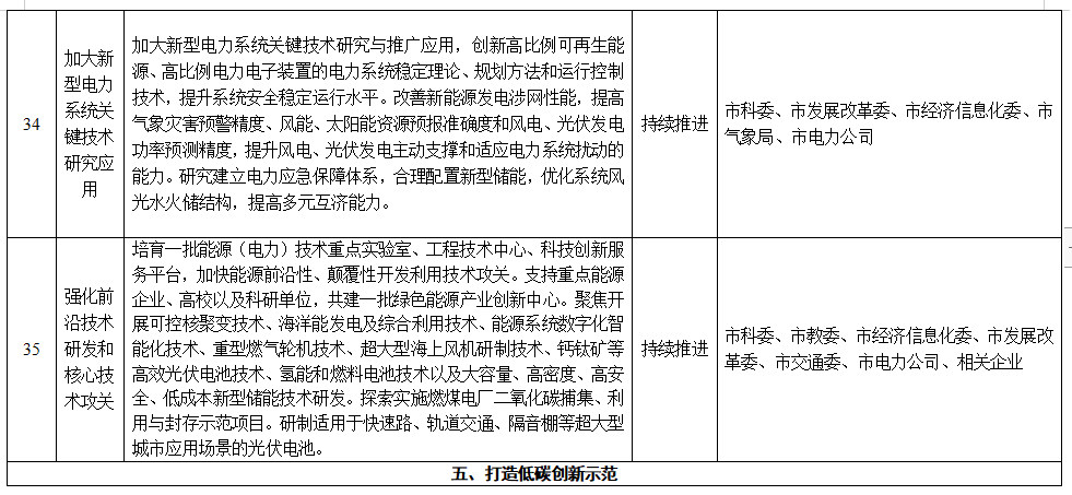 13.強(qiáng)化前沿技術(shù)研發(fā)和核心技術(shù)攻關(guān)。培育一批能源(電力)技術(shù)重點(diǎn)實(shí)驗(yàn)室、工程技術(shù)中心、科技創(chuàng)新服務(wù)平臺(tái),加快能源前沿性、顛覆性開(kāi)發(fā)利用技術(shù)攻關(guān)。支持重點(diǎn)能源企業(yè)、高校以及科研單位,共建一批綠色能源產(chǎn)業(yè)創(chuàng)新中心。聚焦開(kāi)展可控核聚變技術(shù)、海洋能發(fā)電及綜合利用技術(shù)、能源系統(tǒng)數(shù)字化智能化技術(shù)、重型燃?xì)廨啓C(jī)技術(shù)、超大型海上風(fēng)機(jī)研制技術(shù)、鈣鈦礦等高效光伏電池技術(shù)、氫能和燃料電池技術(shù)以及大容量、高密度、高安全、低成本新型儲(chǔ)能技術(shù)研發(fā)。探索實(shí)施燃煤電廠二氧化碳捕集、利用與封存示范項(xiàng)目。研制適用于快速路、軌道交通、隔音棚等超大型城市應(yīng)用場(chǎng)景的光伏電池。