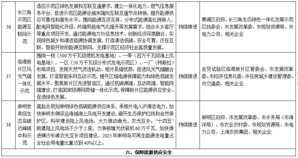 16.崇明世界級(jí)生態(tài)島碳達(dá)峰碳中和示范。高起點(diǎn)規(guī)劃崇明綠色低碳能源供應(yīng)體系,承接外電入滬清潔電力,加快崇明東側(cè)深遠(yuǎn)海域海上風(fēng)電開(kāi)發(fā)建設(shè),避開(kāi)生態(tài)保護(hù)紅線和自然保護(hù)區(qū),科學(xué)建設(shè)陸上風(fēng)電場(chǎng),大力推動(dòng)漁光、農(nóng)光互補(bǔ)?!笆奈濉毙陆懮巷L(fēng)電場(chǎng)不少于2座,力爭(zhēng)新增光伏裝機(jī)60萬(wàn)千瓦,加快推進(jìn)橫沙東灘農(nóng)光互補(bǔ)項(xiàng)目建設(shè)。2025年崇明島可再生能源發(fā)電量占全社會(huì)用電量比重達(dá)到40%以上。