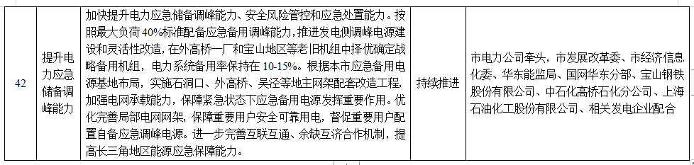 20.提升電力應(yīng)急儲(chǔ)備調(diào)峰能力。加快提升電力應(yīng)急儲(chǔ)備調(diào)峰能力、安全風(fēng)險(xiǎn)管控和應(yīng)急處置能力。按照最大負(fù)荷40%標(biāo)準(zhǔn)配備應(yīng)急備用調(diào)峰能力,推進(jìn)發(fā)電側(cè)調(diào)峰電源建設(shè)和靈活性改造,在外高橋一廠和寶山地區(qū)等老舊機(jī)組中擇優(yōu)確定戰(zhàn)略備用機(jī)組,電力系統(tǒng)備用率保持在10-15%。根據(jù)本市應(yīng)急備用電源基地布局,實(shí)施石洞口、外高橋、吳涇等地主網(wǎng)架配套改造工程,加強(qiáng)電網(wǎng)承載能力,保障緊急狀態(tài)下應(yīng)急備用電源發(fā)揮重要作用。優(yōu)化完善局部電網(wǎng)網(wǎng)架,保障重要用戶安全可靠用電,督促重要用戶配置自備應(yīng)急調(diào)峰電源。進(jìn)一步完善互聯(lián)互通、余缺互濟(jì)合作機(jī)制,提高長(zhǎng)三角地區(qū)能源應(yīng)急保障能力。