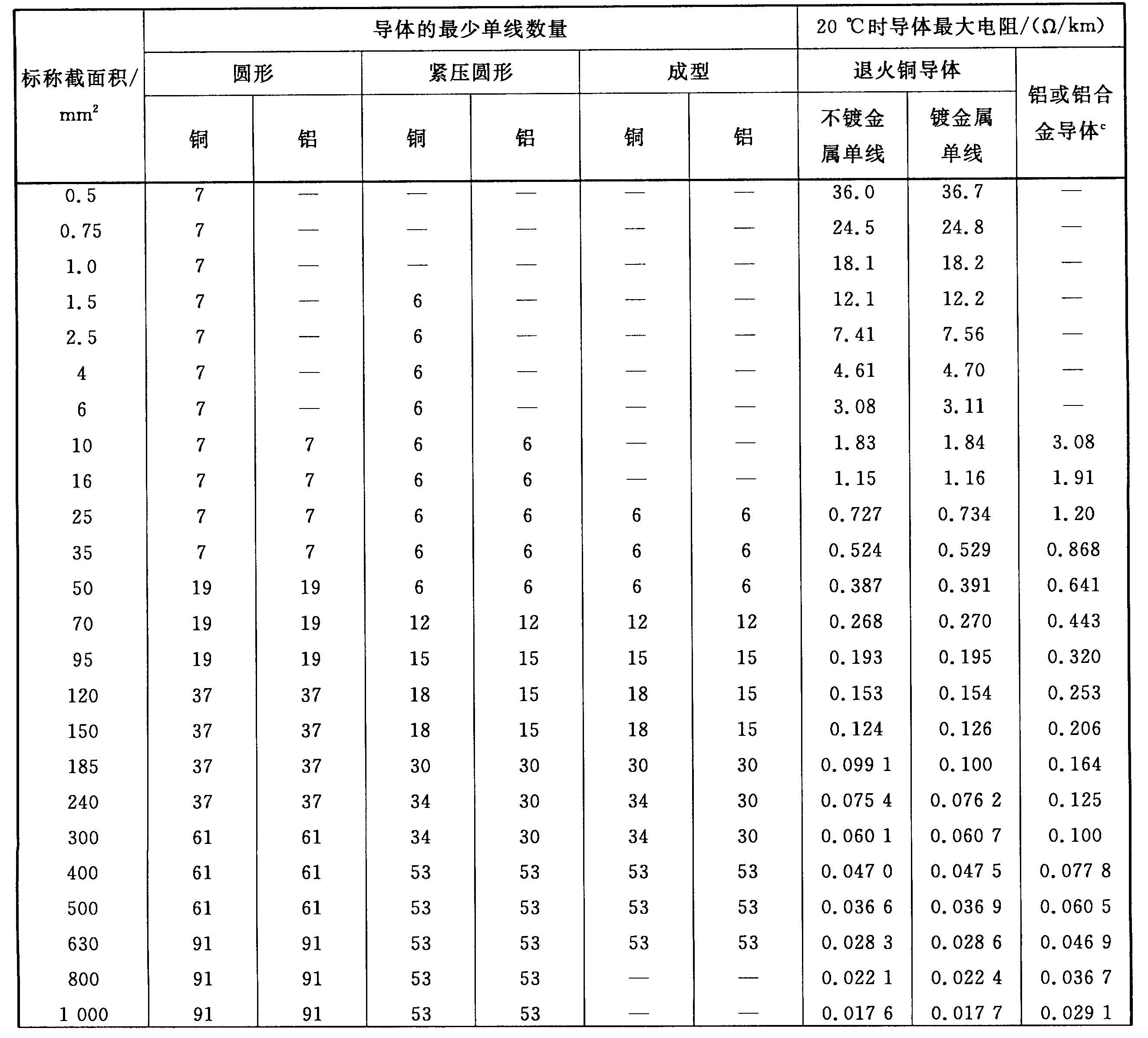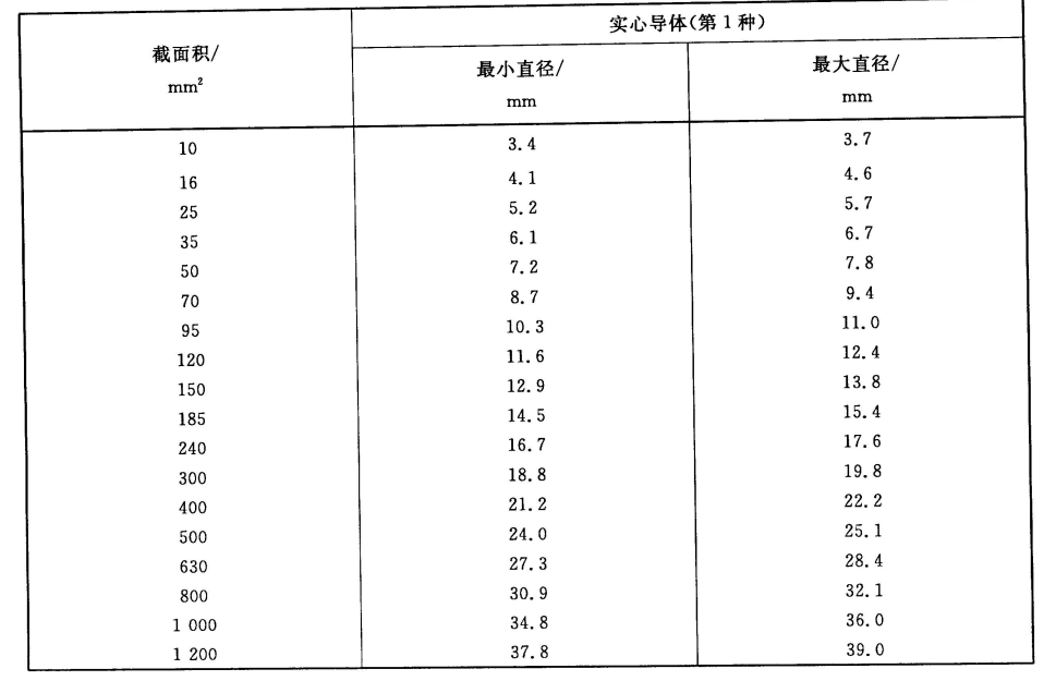表1 單芯和多芯電纜用第1種實(shí)心導(dǎo)體