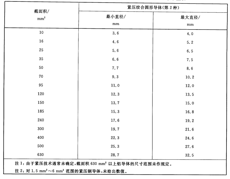 銅、鋁和鋁合金的緊壓絞合圓形導(dǎo)體的尺寸范圍應(yīng)不超過(guò)表C.2給出的最大值,且不小于其最小值。