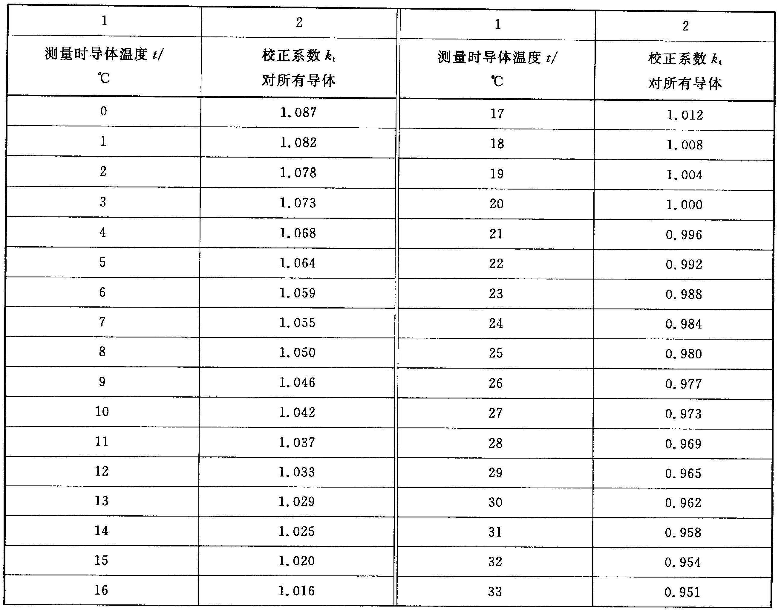 表A.1 導(dǎo)體電阻值的溫度校正系數(shù)kt,校正t℃至20℃時(shí)的測(cè)量電阻值