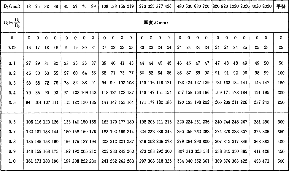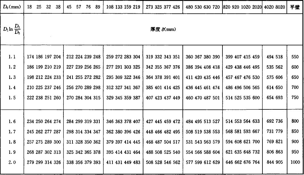 D.0.1 絕熱厚度計(jì)算中D1lnD1/D0~δ關(guān)系(圖D.0.1)應(yīng)按表D.0.1確定。