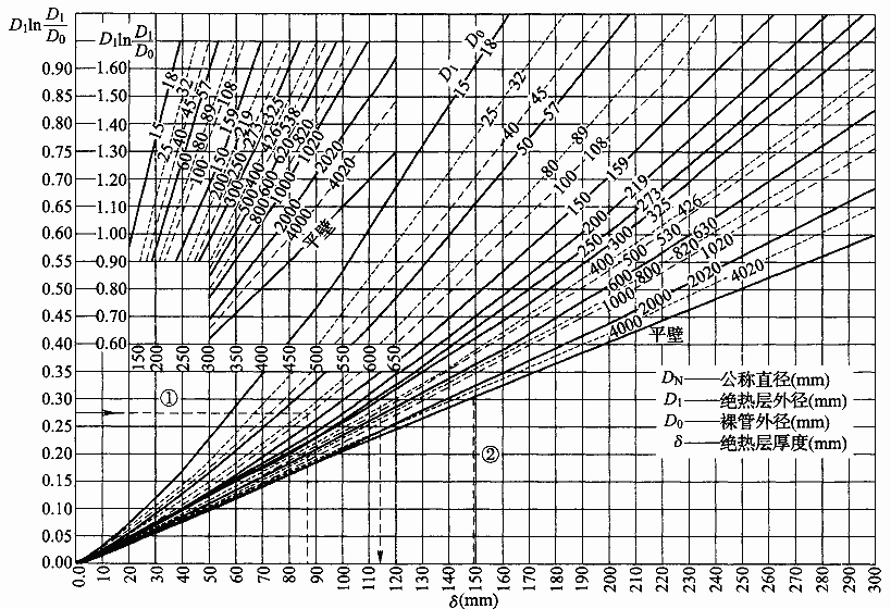 注:D0-裸管外徑;D1-絕熱層外徑;δ-絕熱層厚度。