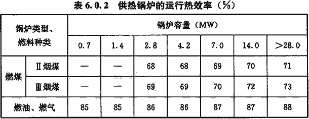 1 供熱鍋爐運(yùn)行熱效率應(yīng)符合表6.0.2的規(guī)定。
