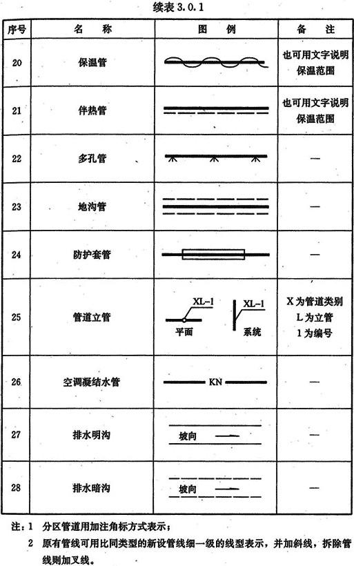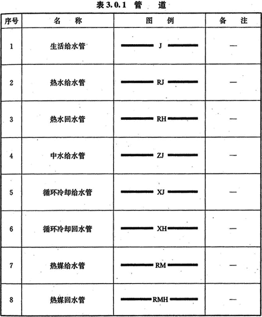 3.0.1 管道類別應(yīng)以漢語拼音字母表示,管道圖例宜符合表3. 0. 1的要求。