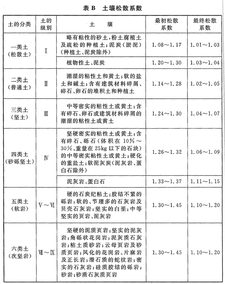 2一類~八類土壤,挖方轉(zhuǎn)化為虛方時,乘以最初松散系數(shù);挖方轉(zhuǎn)化為填方時,乘以最終松散系數(shù)。
