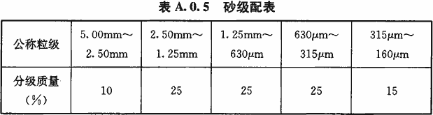 3 應將骨料制成砂樣并縮分成約5kg,按表A.0.5中所示級配及比例組合成試驗用料,并將試樣洗凈烘干或晾干備用。