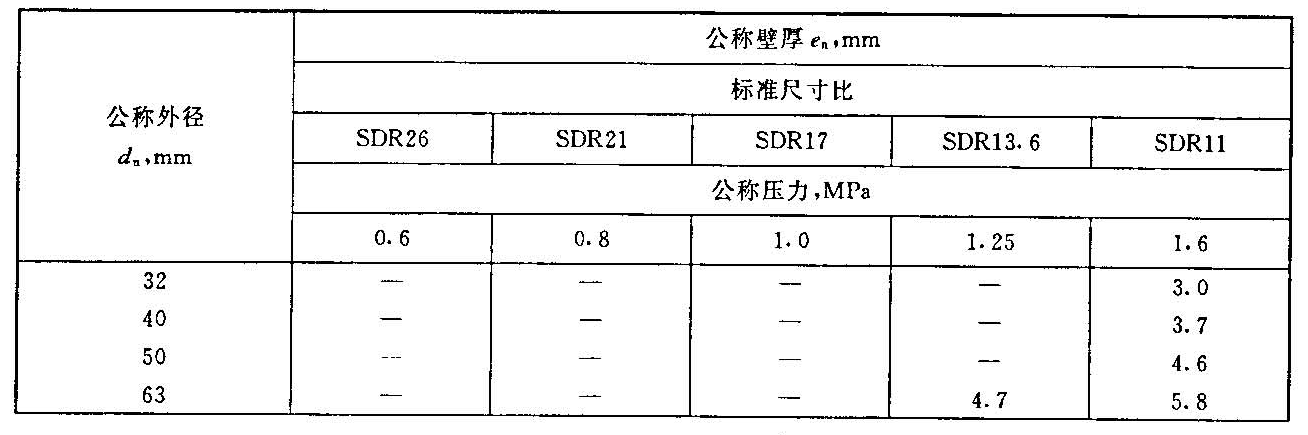 表4 PE63級聚乙烯管材公稱壓力和規(guī)格尺寸