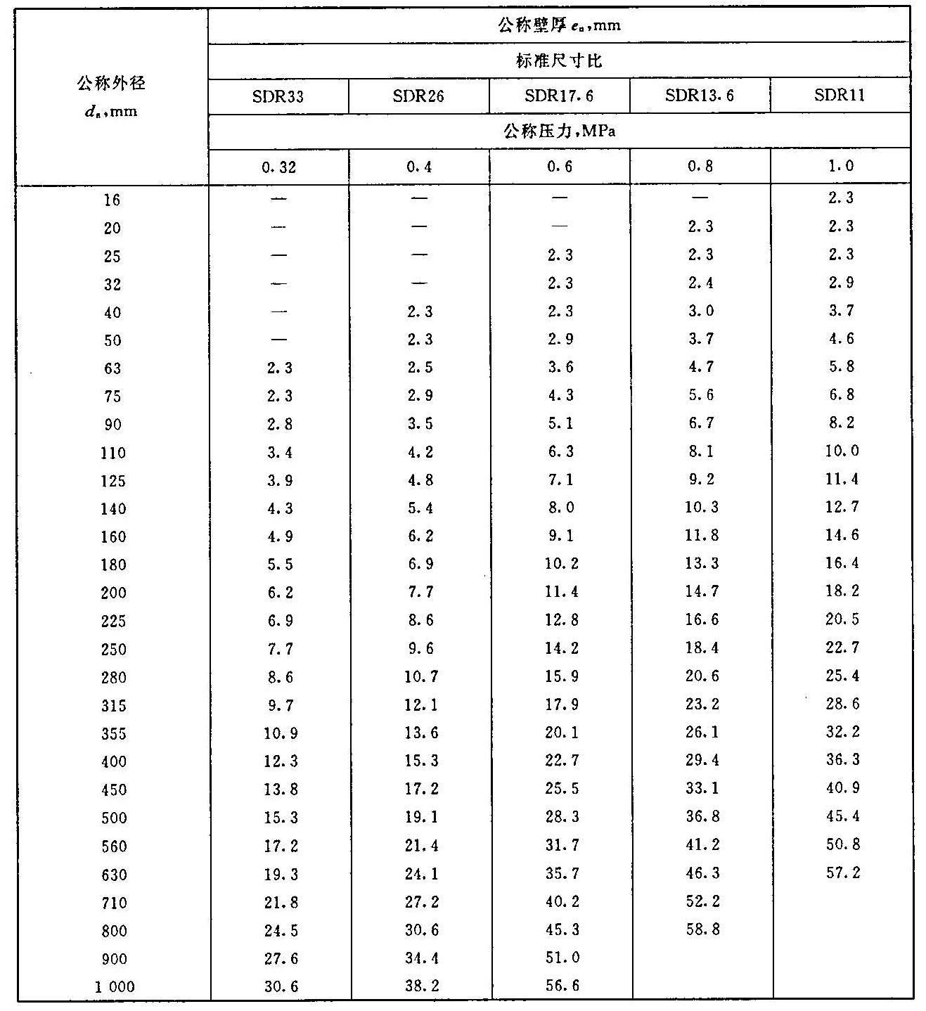 5.4 使用PE 63、PE 80和PEl00等級材料制造的管材,按照選定的公稱壓力,采用表3中的設(shè)計應(yīng)力而確定的公稱外徑和壁厚應(yīng)分別符合表4、表5和表6的規(guī)定。