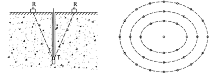 3 當(dāng)構(gòu)件只具有一個(gè)測試面時(shí),宜采用鉆孔和表面測試相結(jié)合的方法,應(yīng)在測試面中心鉆孔,孔中放置徑向振動(dòng)式換能器作為發(fā)射點(diǎn),以鉆孔為中心不同半徑的圓周上布置平面換能器的接收測點(diǎn),同一圓周上測點(diǎn)間距一般為100mm~300mm,不同圓周的半徑相差100mm~300mm,大型構(gòu)件可適當(dāng)放寬,同一圓周上的測點(diǎn)作為同一個(gè)構(gòu)件數(shù)據(jù)進(jìn)行分析(圖D.0.3—3)。