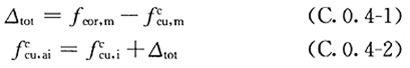 C.0.4 當(dāng)采用總體修正量法時(shí),芯樣抗壓強(qiáng)度應(yīng)按本標(biāo)準(zhǔn)第3.4.7條的規(guī)定確定推定區(qū)間,推定區(qū)間上限與下限差值不應(yīng)大于其均值的10%??傮w修正量和相應(yīng)的修正可按下列公式計(jì)算:
