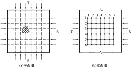 1 當(dāng)構(gòu)件具有兩對(duì)相互平行的測試面時(shí),宜采用對(duì)測法,應(yīng)在測試部位兩對(duì)相互平行的測試面上分別畫出等間距的網(wǎng)格,網(wǎng)格間距可為100mm~300mm,大型構(gòu)件可適當(dāng)放寬,編號(hào)確定對(duì)應(yīng)的測點(diǎn)位置(圖D.0.3—1)。