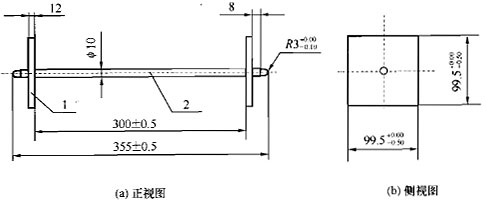 2)縱向限制鋼筋應(yīng)采用直徑為10mm、橫截面面積為78.54mm2,且符合現(xiàn)行國家標(biāo)準(zhǔn)《鋼筋混凝土用鋼 第2部分:熱軋帶肋鋼筋》GB 1499.2規(guī)定的鋼筋。鋼筋兩側(cè)應(yīng)焊接12mm厚的鋼板,材質(zhì)應(yīng)符合現(xiàn)行國家標(biāo)準(zhǔn)《碳素結(jié)構(gòu)鋼》GB 700的有關(guān)規(guī)定,鋼筋兩端點(diǎn)各7.5mm范圍內(nèi)為黃銅或不銹鋼,測頭呈球面狀,半徑為3mm。鋼板與鋼筋焊接處的焊接強(qiáng)度不應(yīng)低于260MPa。