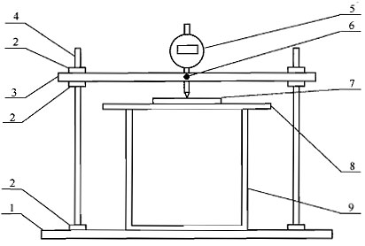 5—千分表;6—緊固螺釘;7—鋼質(zhì)壓塊;8—玻璃板;9—試模