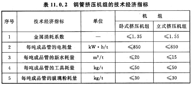 11.0.2 鋼管擠壓機組的技術(shù)經(jīng)濟指標(biāo)宜符合表11.0.2的規(guī)定。