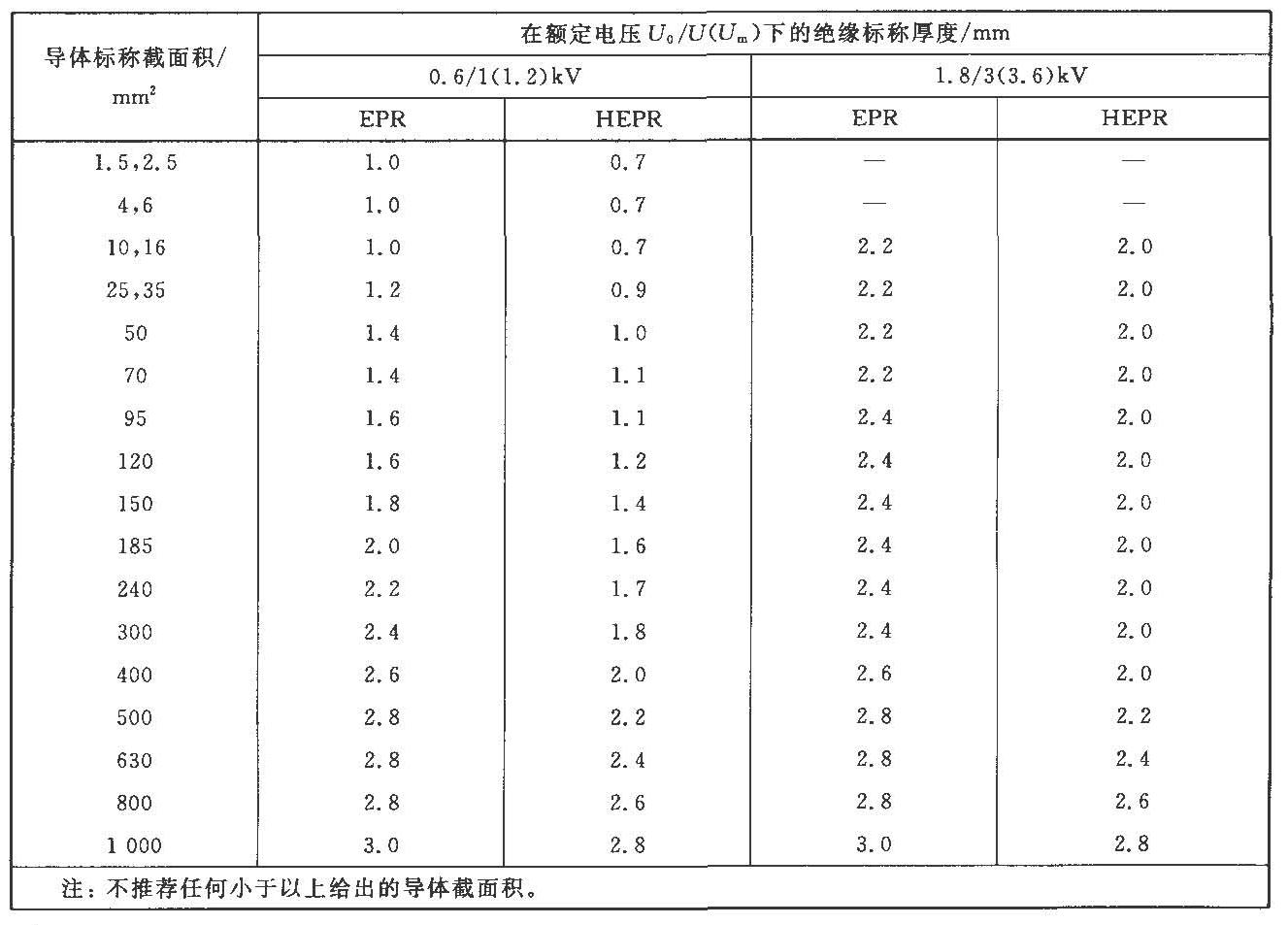 表7 乙丙橡膠(EPR)和硬乙丙橡膠(HEPR)絕緣標(biāo)稱厚度