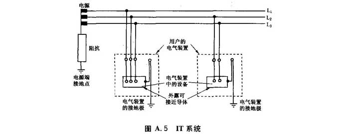 電力系統(tǒng)與大地間不直接連接,電氣裝置的外露可接近導體,通過保護接地線與接地極連接(圖A.5)。