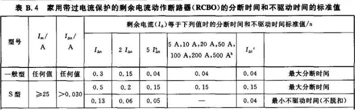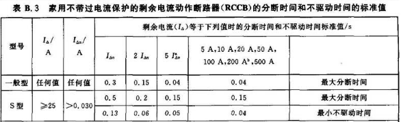 家用不帶過電流保護的剩余電流動作斷路器(RCCB)的分斷時間和不驅動時間的標準值如表B.3。