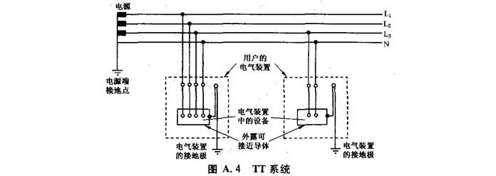 電力系統(tǒng)中有一點直接接地,電氣設備的外露可接近導體通過保護接地線接至與電力系統(tǒng)接地點無關的接地極(圖A.4)。