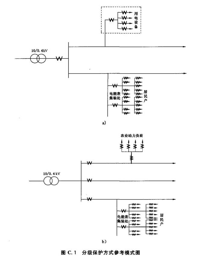 注3:圖c)所示分級保護模式適用于網絡健康水平較高、負荷類型相對比較復雜的城鎮(zhèn)配電網,在用電單位內采用分級保護時,還應考慮采用防電氣火災的剩余電流保護裝置。