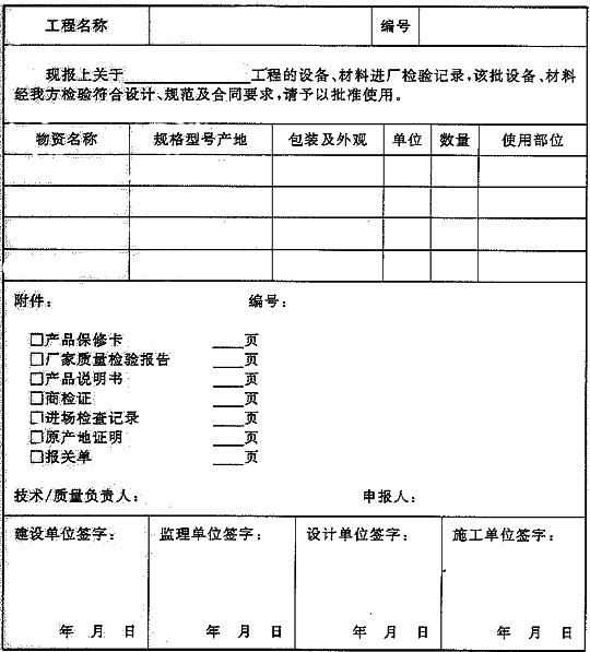 表A.0.1 設(shè)備、材料進(jìn)場報(bào)驗(yàn)單