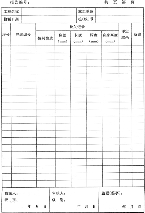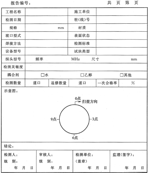 8.0.1 報(bào)告內(nèi)容至少應(yīng)包括:工程名稱、焊接接頭編號(hào)、坡口型式、材質(zhì)、管徑、壁厚、檢測(cè)標(biāo)準(zhǔn)、檢測(cè)參數(shù)、檢測(cè)內(nèi)容、檢測(cè)人(級(jí)別)、審核人(級(jí)別)、檢驗(yàn)日期、評(píng)定結(jié)果等。檢測(cè)報(bào)告格式宜符合附錄B的規(guī)定。