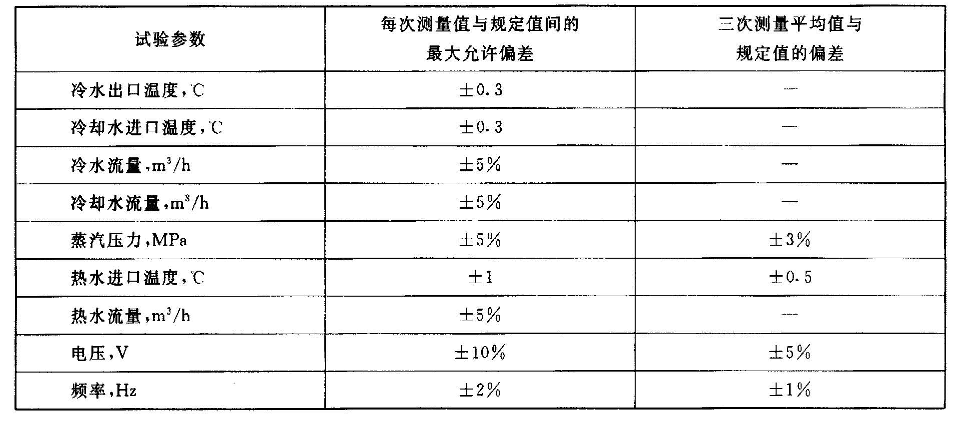 B4 試驗數(shù)據(jù)應(yīng)在工況穩(wěn)定后進行測量,每隔15 min測一次,連續(xù)記錄不少于三次的平均值為計算依據(jù),各數(shù)據(jù)應(yīng)同時測取。試驗參數(shù)的允許偏差應(yīng)符合表B1的規(guī)定。