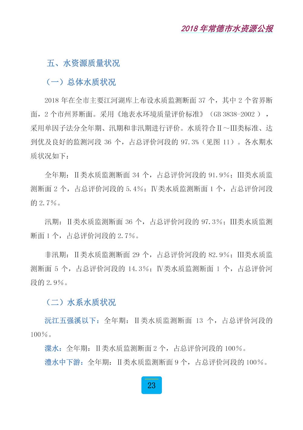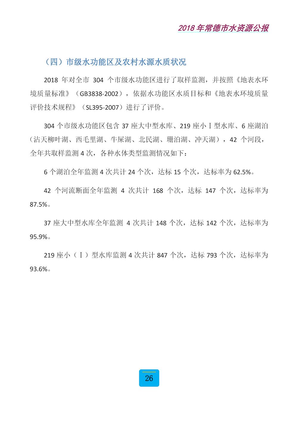 水資源質(zhì)量 2018年在全市主要江河上布設(shè)水質(zhì)監(jiān)測斷面37個(gè),其中 2個(gè)省界斷面,2個(gè)市州界斷面。水質(zhì)符合Ⅱ~Ⅲ類標(biāo)準(zhǔn)、達(dá)到優(yōu)及良好的監(jiān)測河段全年期36個(gè),占總評價(jià)河段的97.3%;對全市列入保護(hù)的304個(gè)水功能區(qū)按季度進(jìn)行了監(jiān)測,其中6個(gè)湖泊達(dá)標(biāo)率為62.5%、42個(gè)河流斷面達(dá)標(biāo)率為87.5%、37座大中型水庫達(dá)標(biāo)率為95.9%、219 座?。á瘢┬退畮爝_(dá)標(biāo)率為93.6%。