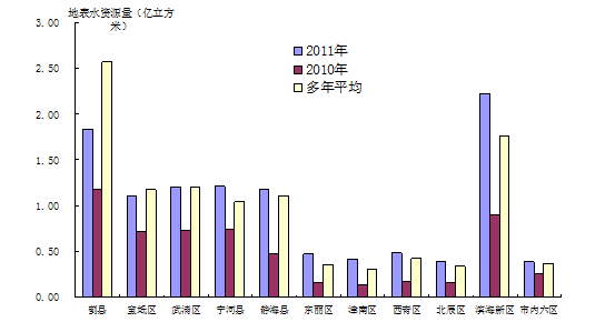 圖9 2011年天津市水資源分區(qū)地下水資源量與上年及多年平均比較