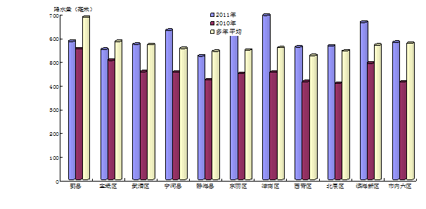 從行政分區(qū)看,津南區(qū)降水量最大,為692.5毫米;靜??h最小,為520.6毫米。與上年比較,各行政分區(qū)均偏多,最多為津南區(qū),偏多53.4%;與多年平均比較,除薊縣、寶坻區(qū)、靜??h偏少外,其他區(qū)縣均偏多,最多為津南區(qū),偏多25.0%。 2011年天津市行政分區(qū)降水量與上年及多年平均比較見圖1。
