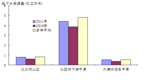 從水資源分區(qū)看,山丘區(qū)地下水資源量0.80億立方米,平原區(qū)地下水資源量4.95億立方米,山丘區(qū)與平原區(qū)重復(fù)計(jì)算量0.53億立方米。2011年天津市水資源分區(qū)地下水資源量與上年及多年平均比較見圖9。