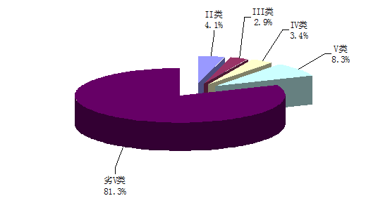 2011年全市廢污水排放量5.77億噸。2011年全年評(píng)價(jià)河長(zhǎng)為1709.8公里,其中II類水河長(zhǎng)69.3公里,占評(píng)價(jià)河長(zhǎng)的4.1%;III類水河長(zhǎng)50.2公里,占評(píng)價(jià)河長(zhǎng)的2.9%; IV類水河長(zhǎng)57.4公里,占評(píng)價(jià)河長(zhǎng)的3.4%;V類水河長(zhǎng)142.4公里,占評(píng)價(jià)河長(zhǎng)的8.3%;劣V類水河長(zhǎng)1390.5公里,占評(píng)價(jià)河長(zhǎng)的81.3% 。全市河流污染比較嚴(yán)重。