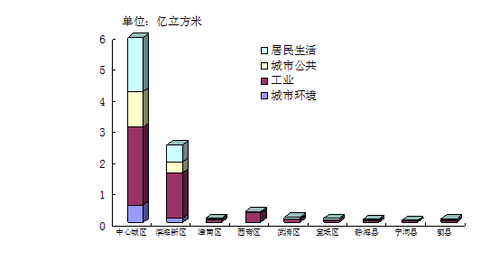 按用途分,居民生活2.57億立方米,城市公共1.59億立方米,工業(yè)用水4.58億立方米,城市環(huán)境0.78億立方米。