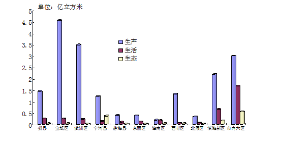 生產(chǎn)用水中,第一產(chǎn)業(yè)用水11.80億立方米,其中農(nóng)田灌溉用水11.34億立方米,林果灌溉用水0.21億立方米,牲畜用水0.25億立方米;第二產(chǎn)業(yè)用水5.26億立方米,其中工業(yè)用水5.01億立方米,建筑業(yè)用水0.25億立方米;第三產(chǎn)業(yè)用水1.34億立方米。