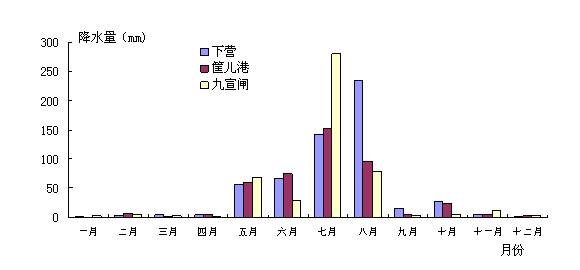 降水量年內(nèi)分配不均,從代表站資料分析,降水量主要集中在汛期(6-9月份),約占78%。2006年降水最顯著的特點(diǎn)是降水日數(shù)多,多次出現(xiàn)籠罩面積很小的局部暴雨,有5站日降雨量超過(guò)100毫米,以張頭窩站的204.5毫米為最大。2006年天津市代表站逐月降水過(guò)程見圖3。