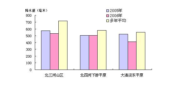 北三河山區(qū)、北四河下游平原、大清河淀東平原降水量分別為533.4毫米、505.8毫米、414.3毫米。與上年比較,分別偏少6.73%、0.07%、20.66%;與多年平均比較,分別偏少25.67%、12.48%、24.81%。2006年各流域分區(qū)降水量與上年及多年平均值比較見圖1。
