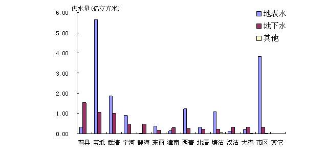 2006年全市總供用水量22.96億立方米,比上年減少0.14億立方米。其中地表水源供水量16.10億立方米,包含引灤水量5.81億立方米;地下水源供水量6.76億立方米;深度處理的再生水回用量0.08億立方米;海水淡化量0.02億立方米。按用水項(xiàng)目劃分,生產(chǎn)用水量19.35億立方米,生活用水量3.12億立方米,生態(tài)用水量0.49億立方米。