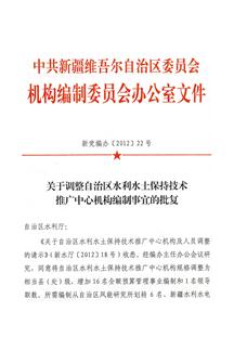 新疆維吾爾自治區(qū)委員會機構編制委員會批復新疆水土保持生態(tài)環(huán)境監(jiān)測總站機構規(guī)格調整為縣(處)級,增加16名全額預算管理事業(yè)編制和1名領導職數(shù)(批復文件 “新黨編辦【2012】22號”)。