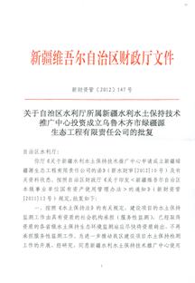 2012年6月5日,烏魯木齊市綠疆源生態(tài)工程有限責任公司成立。該公司為水利廳所屬新疆水土保持生態(tài)環(huán)境監(jiān)測總站投資,財政廳批復同意成立(新財資管【2012】147號)。