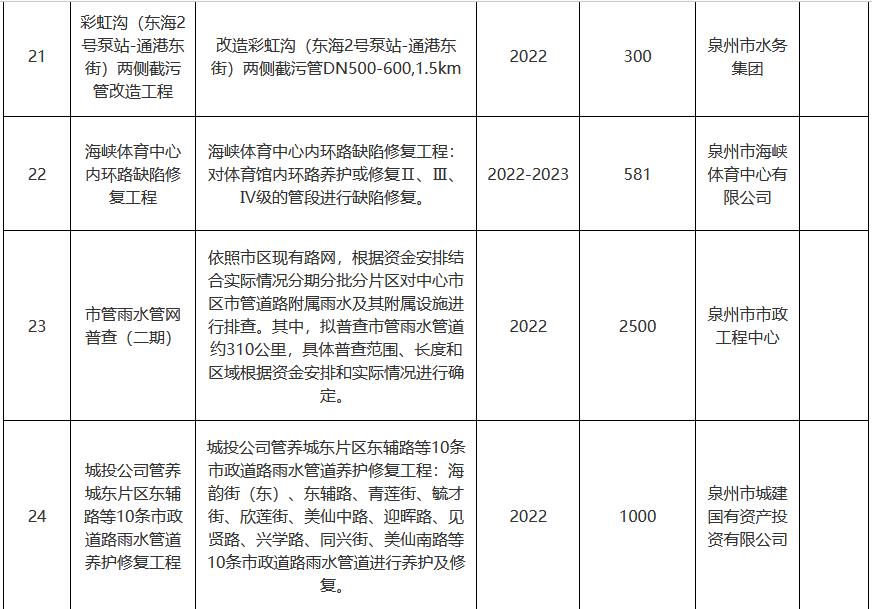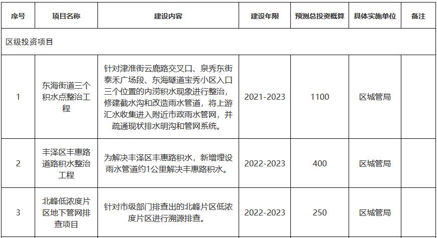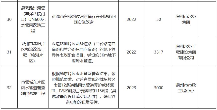 針對城鄉(xiāng)污水提質(zhì)增效工作建設(shè)周期長、投入資金大、涉及部門多,專業(yè)性強,見效慢等特點,按照輕重緩急,分析項目效益,分期實施項目,確保逐年策劃一批、落地一批,實施一批,見效一批。2022年度我區(qū)范圍內(nèi)啟動實施的污水提質(zhì)增效項目計劃實施32個,總投資約109000萬元。排查、修復(fù)和提升改造寶洲片區(qū)和北峰片區(qū)約300Km雨污水管道,新建約23Km雨污水管網(wǎng)。其中由我區(qū)啟動實施的城鎮(zhèn)污水處理提質(zhì)增效項目總計17個,總投資約45000萬元。由市級相關(guān)部門啟動實施的項目為15個,總投資約64000萬元。2022年度提質(zhì)增效項目計劃(第一批)詳見附件,后續(xù)根據(jù)工作推進情況動態(tài)調(diào)整。(牽頭單位:區(qū)管網(wǎng)辦、住建局,責(zé)任單位:屬地街道、豐澤水務(wù)公司)